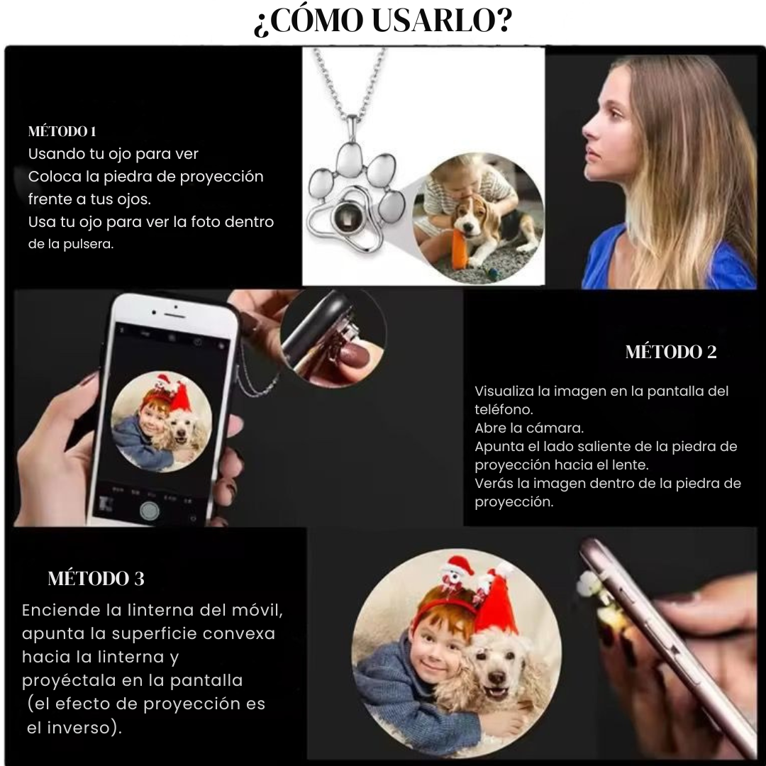 La bolita central del collar proyecta la imagen de tu mascota mediante una microproyección. Puedes verla al mirar a través de ella o iluminándola con una linterna (como la del celular) sobre una superficie oscura.